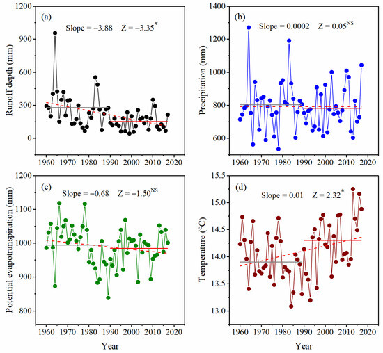 Change trends of the annual (a) runoff depth, (b) precipitation, (c) potential evapotranspiration and (d) temperature in the Danjiang River watershed from 1960 to 2017. The red dashed lines indicate linear trend lines; the gray solid lines and red solid lines represent the average values in the reference period and change period, respectively; the Z values are the results of the Mann–Kendall test (* significant at p < 0.05; NS not significant at p < 0.05).