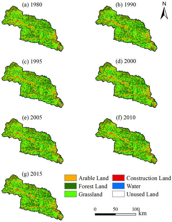 The land use types in the Danjiang River watershed were arable land, forest land, and grassland (Figure 4). The grassland was the largest, followed by forest land, and the area of unused land was the smallest in each period. Spatially, the grassland was distributed widely, while the arable land and construction land were mainly distributed adjacent to the river system. From 1980 to 2015, the area of the arable land followed a pattern of decrease–increase–decrease–increase, reaching its maximum value (1557 km2) in 2000, accounting for 21.97% of the drainage area, whereas the change pattern of the forest land and grassland area was opposite to that of the arable land area generally. Although the area of the construction land and water in each period was less than 1% of the total watershed area, the area of construction land has continued to increase and reached 0.91% in 2015.