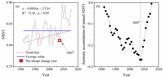(a) Variations in the annual NDVI and (b) anomaly accumulation curve of the annual NDVI in the watershed from 1982 to 2015 (* significant at p < 0.05).