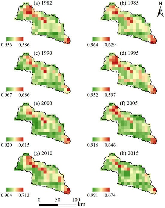 Corresponding to the spatial distribution of land use and to better understand vegetation cover changes, the spatial distribution of the annual NDVI in 1982, 1985, 1990, 1995, 2000, 2005, 2010, and 2015 were selected and presented (Figure 6). The overall spatial distribution of the annual NDVI showed obvious heterogeneity, with the characteristics of annual NDVI values low in the middle and high in the periphery. Although the overall vegetation coverage of the Danjiang River watershed was luxuriant and the average NDVI was relatively high, the upstream area and the outlet, especially the northwest corner, have always been low-value areas for the NDVI, with NDVI values around 0.6. From 1982 to 1985 and then to 1990, the vegetation coverage in the watershed continued to increase, while from 1990 to 1995, the vegetation coverage decreased slightly, which was consistent with that shown in Figure 5a. The comparison of Figure 6a,h shows that the vegetation coverage of the watershed has been improved on the original basis.