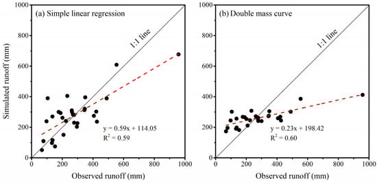 The scatterplots of observed and simulated runoff in the reference period (1960–1989) calculated with (a) the simple linear regression method and (b) the double mass curve method.