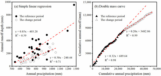 The runoff variation analysis with (a) the simple linear regression method and (b) the double mass curve method from 1960 to 2017.