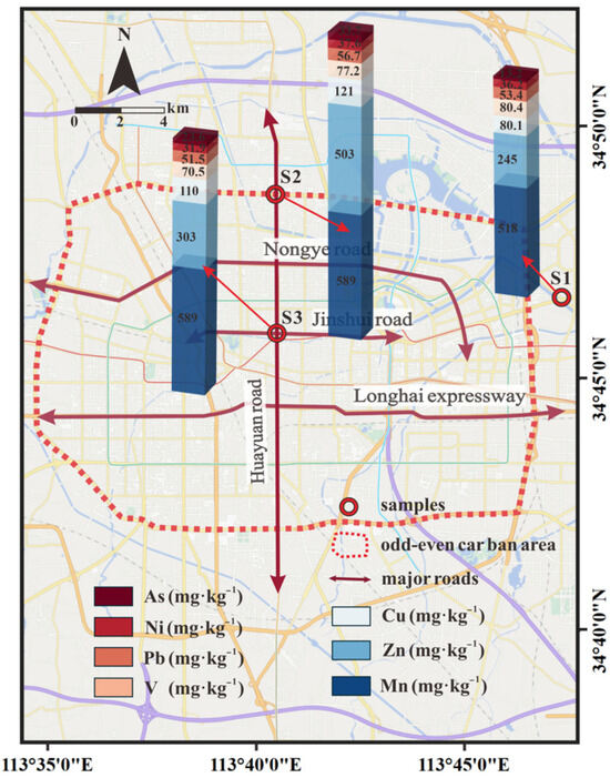 Spatially, total concentrations of heavy metals varied across the three studied functional areas. The traffic area (S2) was the most polluted in terms of the total concentration of heavy metals of Cu, Zn, As, Pb, and Ni, while the pollution levels were lower in the culture and education area (S1) and commercial area (S3), regarding the total concentrations of V and Mn, respectively (Figure 2). For Cu, Zn, and As, the highest mean content was observed in the traffic zone, with values of 121 mg/kg, 503 mg/kg, and 33.7 mg/kg, respectively. In contrast, the culture and education zone exhibited the lowest mean content for these heavy metals at 80.1 mg/kg, 245 mg/kg, and 13.2 mg/kg, respectively. The highest (80.4 mg/kg) and lowest (70.5 mg/kg) mean concentrations of V were observed in the cultural and educational area and the commercial area. For Pb, Mn, and Ni, the mean concentrations of different functional areas were relatively constant.