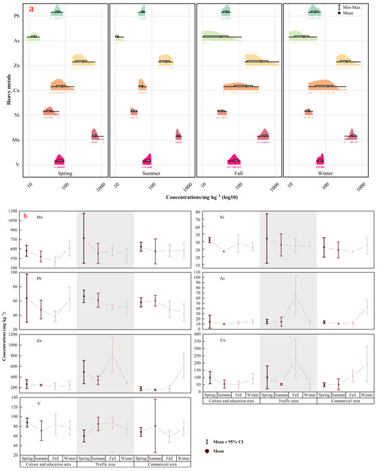 Seasonal variations in heavy metal concentrations. (a) The mean concentrations of heavy metals. (b) Seasonal variations in heavy metal concentrations from three functional areas. Note: (a) The ends of the half box represent the 25th and 75th percentile values, respectively. The horizontal line at the bottom and top denotes the minimum and maximum concentration. The data distribution is depicted by colorful dots. (b) Data are represented as the mean ± 95% CI (confidence interval). The solid circle represents the mean heavy metal concentrations.