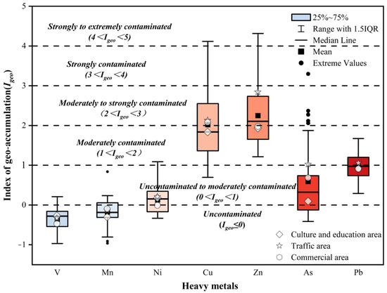 Regarding the three functional areas, the mean Igeo values for most heavy metals in the traffic area were higher than the other two areas, especially for Zn and As, indicating higher contamination levels. The mean values of Igeo for V and Mn were all below 0, indicating the uncontaminated level. The mean Igeo values for Ni and Pb in the three areas showed limited variation, demonstrating the uncontaminated to moderately contaminated level. The mean values of Igeo for Cu, Zn, and As all followed the sequence: traffic area > commercial area > cultural and educational area, ranging from uncontaminated to moderately contaminated up to moderately to strongly contaminated levels.