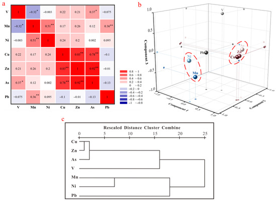 The correlation coefficient analysis is widely applied to investigate inter-element relationships, which could indicate the affiliation of their potential sources [93,94,95]. Pearson’s correlation coefficient analysis was conducted in this study and the analytical results were depicted as a heatmap (Figure 5a). Elemental pairs, such as As-Zn (0.92), Cu-Zn (0.83), and As-Cu (0.78), exhibited significant positive correlations at the significance level of p < 0.01, indicating a potential common source for As, Zn, and Cu. A weakly positive correlation between Mn-Ni (0.51) and Mn-Pb (0.36) at a level of p < 0.01 as well as V-As (0.37) at level of p < 0.05 demonstrated that these metals have some relevance but could be contributed by diverse sources.