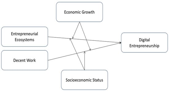 By delving into these multifaceted dimensions, this research contributes to the theoretical advancement of entrepreneurship studies, offering fresh insights into the dynamic relationship between entrepreneurship ecosystems, decent work, digital entrepreneurship, growth, and socioeconomic status. It provides a conceptual framework that can guide future research in understanding the evolving landscape of work, economic growth, and entrepreneurship in the digital age and offers theoretical foundations for policy development, with implications that extend to fostering inclusive economic growth and sustainable development in an increasingly digitalized global economy [63].