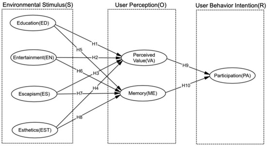 The stimulus–organism–response (SOR) theory, proposed by Mehrabian and Russell in 1974 [38], explains how external environmental stimuli can influence an individual’s internal state, subsequently leading to behavioral changes [10,39]. The theory can be used to explain how experiential stimuli from serious games can affect a user’s experiential state and thus change the user’s behavioral intention. Therefore, we developed an integrative framework by combining SOR theory with experiential economic theory. We define stimulus factors (S) as external environmental stimuli that influence users’ behavioral intentions, summarized in the four experiences of serious games (educational, entertaining, escapist, esthetic). Organic factors (O) pertain to a user’s internal emotional and experiential states, which are summarized in this study as perceived value and memory. Reaction (R), on the other hand, refers to the user’s behavioral intentions, encompassing the actions that occur following changes in cognition and emotions due to internal and external stimuli. In this study, this is summarized as participation [40].