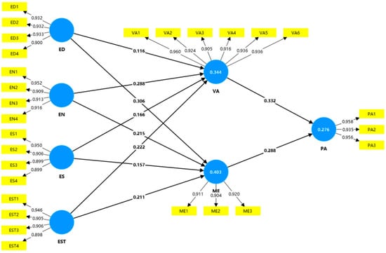 To assess the reliability and validity of the questionnaire, a factor analysis was conducted in PLS-SEM and Cronbach’s alpha, composite reliability (CR), and AVE were calculated. Cronbach’s alpha is used to measure the internal consistency or reliability among the items in a questionnaire, test, or survey. Typically, a Cronbach’s α value greater than 0.7 indicates that a scale has good internal consistency [106]. Factor loading indicates the correlation coefficient between an observed variable and a latent factor, reflecting the proportion of the factor’s contribution to the variance in the explanatory variable. Factor loadings greater than 0.7 are usually regarded as high correlations, indicating a strong correlation between the observed variable and the underlying factor [107].