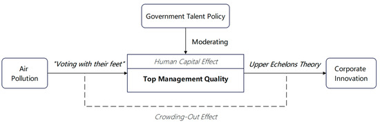 China faces the dual challenge of advancing environmental governance while sustaining robust economic development. In 2023, China’s 339 prefectural and larger cities did not comply with the air quality criteria, which provides a suitable research scenario for our study [26]. We used a sample of public companies in the Chinese Shanghai and Shenzhen markets from 2004 to 2019 to empirically study the effects of air pollution (PM 2.5 concentration) on corporate innovation with respect to the locations of the companies. We focused on testing the mediating role played by the quality of top management, as well as the role of government talent policies as a moderator. In addition, this study analyzes the moderating role of government environmental attention and executive compensation. Finally, the robustness of the results is verified through rigorous endogeneity and robustness tests. We obtained four main findings. First, air pollution significantly inhibits firms’ innovation output. Second, air pollution significantly reduces the quality of corporate top management. Third, the top management quality mediates the effect of air pollution on firms’ innovation. Fourth, local government talent policies have been shown to alleviate the detrimental influences of air pollution on firms’ innovative capabilities to a significant degree. Moreover, this study reveals that executive compensation mitigates the adverse effect of air pollution on firm innovation to some extent. Meanwhile, government environmental attention exacerbates the adverse effect of air pollution on firm innovation. These results offer governments and businesses a theoretical foundation and empirical support for preventing and controlling air pollution, optimizing talent conservation, and maximizing talent benefits. Furthermore, they hold great theoretical and practical importance in advancing the superior growth of transition economies.