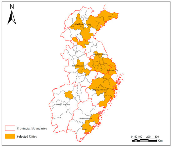 East China stands as one of China’s foremost economically developed regions, including eight provinces and cities such as Shanghai, Jiangsu, Zhejiang, Anhui, Jiangxi, Fujian, Shandong, and Taiwan (data missing, not studied at the moment). In 2019, the region’s GDP accounted for 38.02% of China’s total and its population was 29.97%. However, rapid economic development has also brought about the problem of high energy consumption. In 2019, East China represented 29.69% of the total energy consumption of China, ranking it first among the seven major regions in China. High energy consumption means high CO2 emissions. At the same time, with a plethora of urban agglomerations in the East China region, the rapid urban growth will undeniably result in significant environmental challenges associated with increased emissions. Therefore, 30 cities in East China were selected as the specific study area. The specific study area is shown in Figure 1.