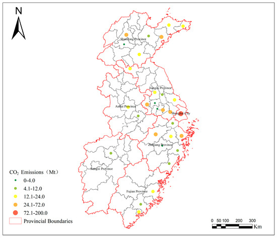 The data used in this study include CO2 emission and spatial distribution data of buildings in East China in 2019 (Figure 2). The CO2 emission data come from ODIAC (Open Source Data Inventory for Anthropogenic CO2) [32,33], which is comprehensive, combined with multiple source remote sensing data, nonpoint source data, and fossil fuel consumption statistics for the estimation of CO2 emission, and have been verified for accuracy.