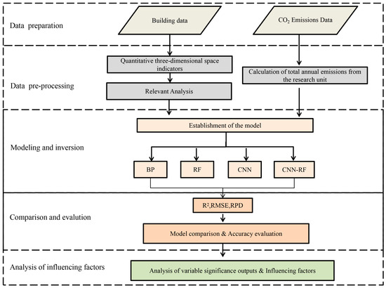 This study examines urban agglomeration in East China and integrates urban building data and anthropogenic CO2 emissions data using a machine learning model to explore the relationship between the three-dimensional spatial structure of the city and CO2 emissions. By comparing and analyzing the BP, RF, CNN, and CNN-RF models, we assess the predictive capabilities of these models for CO2 emissions. Furthermore, we explore the primary three-dimensional spatial factors that influence CO2 emissions. The main conclusions are as follows.