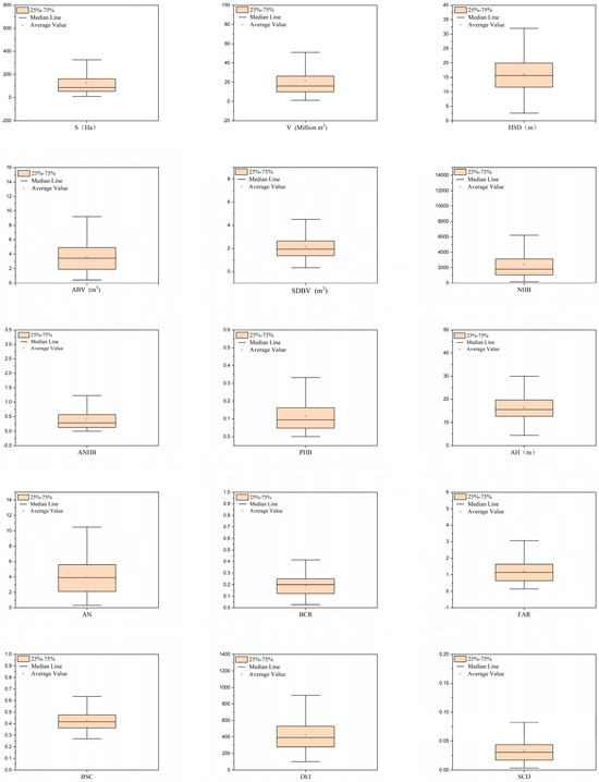 In this study, we computed a series of spatial indicators using specific building data for each city. The distribution of these indicators across cities is visualized in the form of a box plot, as depicted in Figure 6. Owing to disparities in economic activity and geographic contexts between cities, the figures for diverse indicators show considerable variance among urban centers. For example, in BCR, the box plot shows a centralized distribution around 0.19, with an overall range mainly between 0.10 and 0.25. The centralized value of the number of buildings for indicator N is 2419. The minimum number of buildings is 178, and the maximum is 17,281. In the BSC, the concentration value is 0.43, with an upper limit of 0.27 and a lower limit of 0.70. Other spatial indicators, such as N, S, V, AH, and AVB, also exhibit their distributional characteristics across cities. The distribution ranges of the three-dimensional spatial indicators quantified in this study are generally consistent with the findings of Xu and Dong et al. [29,31].
