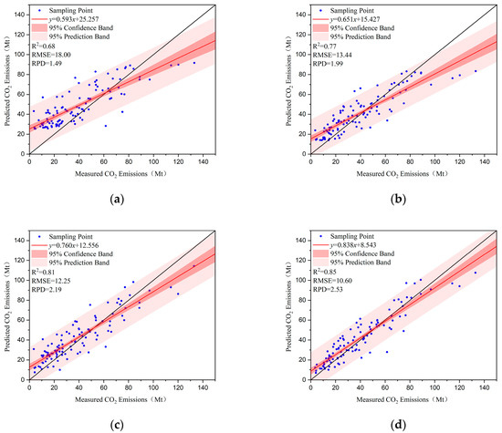 Scatter diagrams depicting the results of estimations made by four distinct models: (a) BP, (b) RF, (c) CNN, and (d) CNN-RF. The obtained CO2 emissions represent the actual values, and the CO2 emissions computed by the model signify the predict values.