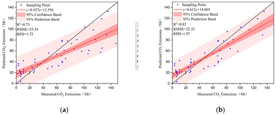 Verification scatter plots of the two models: (a) CNN and (b) CNN-RF. The obtained CO2 emissions represent the actual values, and the CO2 emissions computed by the model signify the predict values.