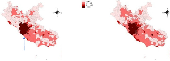 Population density (inhabitants/km2) in Latium municipalities at the beginning ((left): 1970) and the end ((right): 2020) of the study period; blue arrow indicates the position of Rome’s municipality.