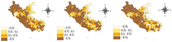 The empirical results from MFA, as they were illustrated in Figure 5 and briefly described above, can be read in light with another statistical evidence of change, e.g., considering an indicator of climate warming of interest for agronomic practices and agricultural productions. This indicates soil aridity—a value that informs, together, about the reduction of total rainfall and the synchronic increase of reference crop evapotranspiration because of local warming. Wheat, a rain-fed crop moving along the first MFA axis toward positive values, showed an evident decrease in the invested surface areas at the regional scale and a relocation from their traditional sites in Latium (i.e., plains) to mountainous areas—according to recent literature evidence [32]. This individual process of landscape transformation can be related to the increasing aridity of flat areas, as documented in Figure 6. As a matter of fact, the two maps in Figure 6 delineate a particularly high ‘average’ soil aridity index (IA < 0.95) estimated at the beginning of the study period (1961–1970) along the coastal rim from Rome to Viterbo (the driest district in Latium), with increasing IA values, representative of more humid climate conditions, in mountainous locations of Rieti and Frosinone provinces.