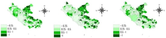 The distribution of the WOO indicator in Latium municipalities was mapped in Figure 3 diachronically for 1970, 1990, and 2020. According to the elevation gradient, the highest values of WOO (>1) were observed in inland, mountainous districts of the Apennines chain (Rieti province) where farmland mosaics are frequently intermixed with some (deciduous) woodlots within the farm boundaries, especially in sloping areas. On average, more than one hectare of woodlands was available to farmers for each hectare of utilized agricultural land in such districts. Values of WOO below 0.25 were systematically observed in lowland districts of Viterbo and Latina provinces and in the large part of Rome province because of the increasing human pressure due to intense urbanization. In line with the aggregated results presented in Table 2, maps revealed that WOO maintained almost stability along coastal areas over the study period, where woodlots’ surface area represented less than 10% of the rural land-use classes in several municipalities with flat orography.