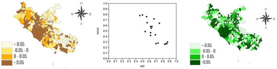 While ‘intensification’ and ‘extensivation’ processes evolved under a balanced path over time at the regional scale (Latium), a more detailed analysis considering provinces and elevation belts delineates different trajectories of rural development. A strong competition on land was observed in lowland districts and favored crop intensification; a lower level of competition was instead recorded in mountainous districts, leveraging land abandonment and on-farm forestry, taken as a signal of ‘extensivation’. As a matter of fact, the empirical results of a non-parametric correlation analysis between INT and WOO values (Figure 4) delineate a substantial, negative relationship between the two processes along the elevation gradient from lowlands to mountainous districts, reflecting an intense ‘land competition’ between ‘intensification’ and ‘extensivation’ processes. These results also confirm the ability of both INT and WOO indicators to depict the progressive ‘intensification’ or ‘extensivation’ of local agricultural systems if monitored over sufficiently long time intervals. Crop intensity, as a proxy of a progressive intensification of farming systems, was associated with a decline in rural forestry at the same observation scale (namely, province and elevation belt). This is also due to the inherent depopulation of mountainous municipalities and the consequent abandonment of cultivated land in remote districts. However, in more urbanized districts, the two indicators have shown less intense dynamics, likely because of the negative impact of urbanization on both agricultural processes.