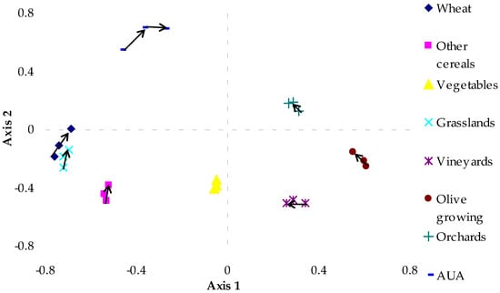 Considering together land-use types such as wheat, other cereals, vegetables, grasslands, vineyards, olive groves, orchards, and the amount of agricultural utilized area (AUA) as an input variable delineating background trends in the region, MFA graphical results (Figure 5) identify distinctive changes over time in the surface area invested into arable land and tree crops (olive, vine, fruits). Axis 1, explaining the largest part of the variance illustrated in the MFA plot, segregated land-use types according to an agronomic gradient distinguishing traditional tree crops (e.g., olive groves, vineyards, orchards) associated with the positive values of axis 1, and selected annual (herbaceous) crops, such as wheat, other cereals, and grasslands, negatively associated with axis 1. Axis 2 distinguished the aggregated dynamics of AUA and, less evidently, of orchards along the positive side of the axis from the explicit dynamics of the remaining land-use types, more or less intensively associated with the negative side of axis 2.