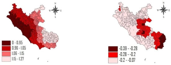 Average values of a soil aridity indicator (1961–1970), calculated as the ratio of total rainfalls to total potential evapotranspiration on an annual basis, by municipality in Latium ((left); smaller values indicate a higher level of soil aridity); per cent change over the study period, namely the last fifty years, 1970–2020 (right); decreasing values of the indicator means higher soil aridity as a consequence of climate change and local warming, with impact on regional agricultural systems.