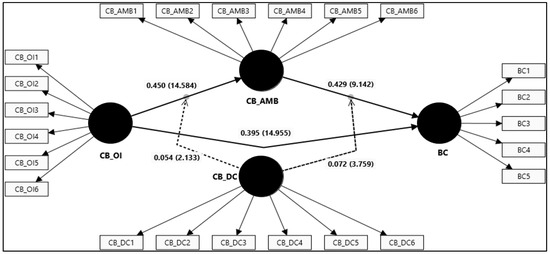The reliability and construct validity of all constructs were tested through a series of empirical analyses. Firstly, Harman’s single factor for common method bias (CMB) was conducted. The results revealed four factors, with one factor explaining 37% of the variance, signifying no evidence of CMB in the dataset [79]. Further, the overall results of the measurement models revealed a good fit; all the values of Cronbach’s alpha and composite reliabilities were not lower than the minimum threshold of 0.70 [75] and ranged between 0.895 and 0.951, indicating the internal consistency of scales. The convergent validity of all constructs was confirmed through average variance extracted (AVE), and all the values of AVE ranged from 0.663 to 0.837, supporting an acceptable level of convergent validity. The factor loadings of four items were found to be less than 0.70 (e.g., CB_AMB1 = 0.636, CB_AMB3 = 0.607, CB_DC2 = 0.679, and CB_OI2 = 0.608); however, these items were kept in the estimation because their values did not negatively affect the reliability and validity of the constructs (see Table 1).