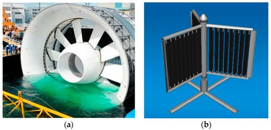 Ocean power generators: (a) horizontal axis [14]; (b) vertical axis [15].