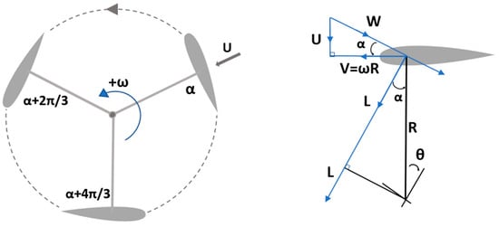The Darrieus turbine operates by generating lift and drag forces on a hydrofoil blade within a water flow. The combined tangential force resulting from the lift and drag causes the turbine to rotate. The angle of attack (α) is the angle between the blade’s pitch position and the flow of ocean currents, which move in a singular direction [28]. This can occur because the turbine continues to rotate, causing an angle between the blade and the current flow [29]. An illustration depicting the angle of attack and the generation of lift and drag forces is provided Figure 4. As illustrated in Figure 4, the angle of attack, in combination with the pitch angle, influences the direction of the loading condition set in the analysis. Therefore, structural blade response will also be investigated in this study by imposing forced displacement in two loading directions.