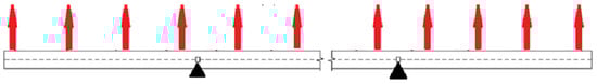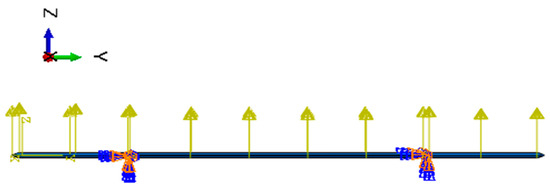 In the simulation of ocean currents, the load is modeled as a distributed load using a body force loading type. Each support is a fixed type support, thus . The boundary condition and loading scheme are illustrated in Figure 10.