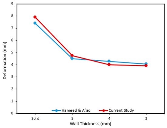 The data in Table 2 reveal the discrepancies between this study and the research conducted by Hameed and Afaq, with an average difference of about 5.7%. The largest deviation was found in the solid blade, while the smallest difference occurred in blades with a wall thickness of 3 mm. This difference arises because of the different types of loading used. In this study, body force loading was used, while in the study conducted by Hameed and Afaq, a line load loading was used.
