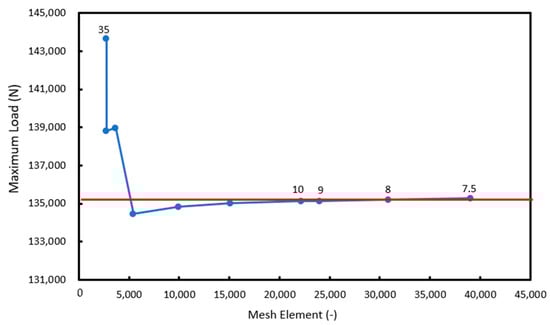 A straight line is drawn on the graph depicting the results of the mesh convergence study (Figure 11) to identify the convergence. In Figure 10, it is evident that a mesh size of 10 mm, corresponding to approximately 22,000 elements, is suitable. This is indicated by the observation that further reductions in mesh size do not significantly impact the results of the numerical calculations.