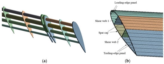 This study explored four frame model configurations. The first model features a bar frame, as depicted in Figure 12a. The second model is inspired by Wang et al.‘s research, which utilized a longitudinal web frame, shown in Figure 12b [42]. The third and fourth configurations involve a solid blade and a hollow blade without any stiffeners, respectively. The code for the frame shape variations can be seen in Table 5.