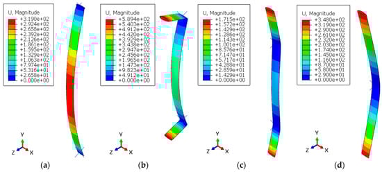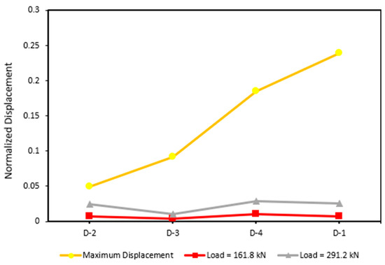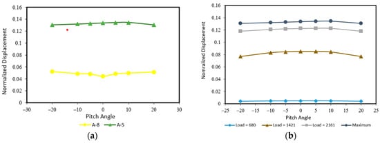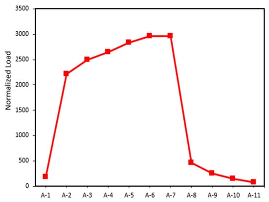 However, in Figure 16a, it can be seen that the maximum displacement in the cantilever region from A-4 to A-7 is higher when compared to A-8 to A-11. This is because A-4 to A-7 can withstand a higher load, resulting in a greater maximum displacement, as shown in Figure 13. Since displacement is directly proportional to load (Equation (1)), the higher the load that can be received, the greater the displacement.