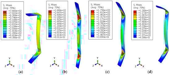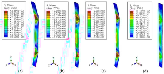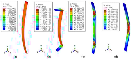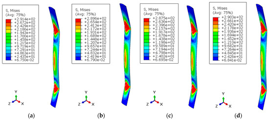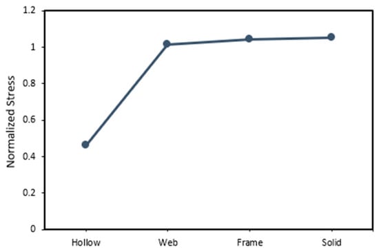The critical point of a structure is determined by determining the von Mises stress, which combines various stress components on a stress plane. A structure will begin to yield when the von Mises stress exceeds the material’s yield stress (). The von Mises stress formula is presented in Equation (4) [36].