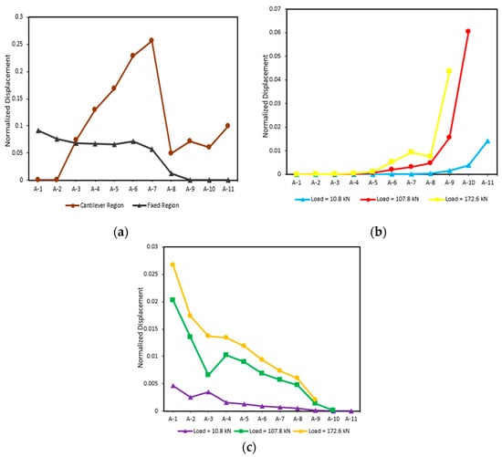 Displacement graph of (a) maximum, (b) cantilever region, and (c) fixed region.