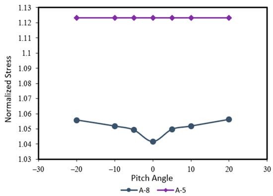 The pitch angle refers to the angle of the turbine blade relative to its axis, optimized to enhance hydrodynamics and achieve a high power coefficient (Cp) [41]. However, differences in pitch angle can affect the load on the turbine blade. Therefore, this study also examined how pitch angle influences the structural strength of the turbine blade. Because ABAQUS CAE cannot provide an angled force, the forces are analyzed in both the normal and tangential directions on the blade surface during simulations. Details of the pitch angle variations are listed in Table 4. In these variations, solid aluminum is used for the blade, with support configurations as in the case of A-8 and A-5.