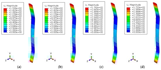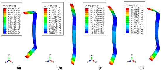Displacement contours for variation (a) D-1, (b) D-2, (c) D-3, and (d) D-4.