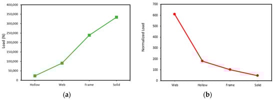 Maximum load in material variations: (a) true maximum load and (b) normalized maximum load.