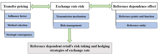 In summary, there exists an implicit relation between transfer pricing strategy and the designation of exchange rate risk bearers. On the one hand, exchange rate risk will be transmitted in different ways through the supply chain under different risk-bearing mechanisms. On the other hand, the adoption of transfer pricing affects the choice of foreign exchange risk-taking and hedging strategies. In addition, reference-dependent psychology is a realistic but often neglected issue in risk management decisions nowadays. Hence, the research theme of this paper based on the literature in the next section is represented in Figure 1. Moreover, the subsequent research questions are focused on the following key issues: