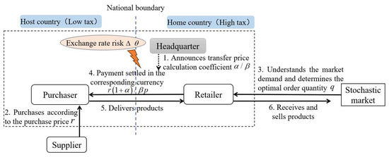 The process of a multi-national supply chain begins with the establishment of internal transfer pricing coefficients by headquarters. Subsequently, the purchaser determines the optimal purchase price, while the retailer conducts a market study to decide on the quantity of products ordered. Exchange rate fluctuations are taken into consideration during the period between payment settlement and actual receipt of products. The purchaser engages with overseas suppliers and delivers products directly to the retailer. It is worth noting that the purchaser leverages its market influence to select suppliers who meet specific procurement criteria, thereby ensuring that the actual market demands are met and surpassed. Finally, in an uncertain home country market, the retailer sells products and receives after-tax returns.