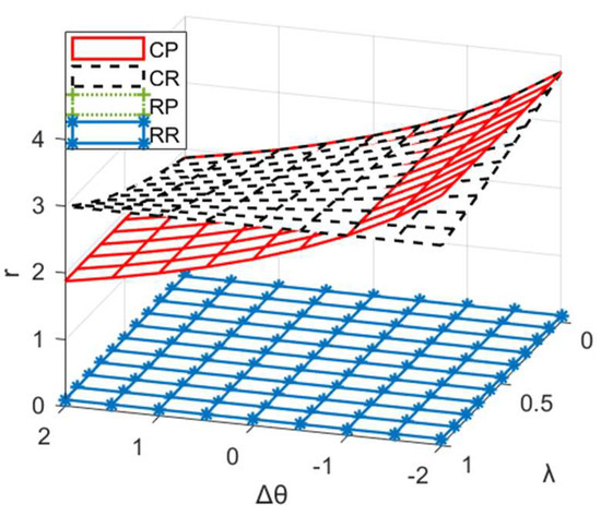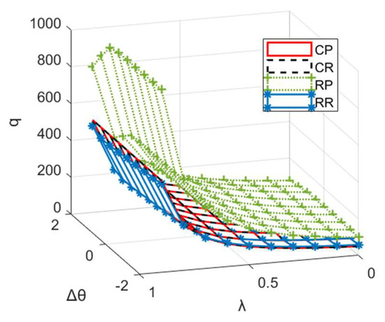 We compare the optimal order volume in the retailer for the four composite modes in Figure 3. The RP mode has the highest order volume, and there is a positive relationship between the order volume of the four modes and the reference-dependent coefficient. Moreover, exchange rate fluctuations could not affect the optimal order volume under the cost-plus strategy. Furthermore, with the exchange rate change changing from negative to positive, the order volume of the RR model retailer sector decreases first and then increases, while the change trend of the RP model is exactly the opposite.