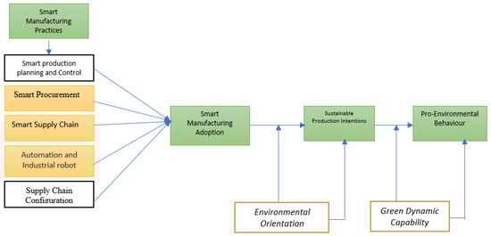The main propositions of the paper are based on NRBV and DCT. These theories have been used in the current study to enhance the relationship between smart manufacturing and pro-environmental behaviour. According to Hart (1995), companies that embrace sustainability principles demonstrate superior performance in comparison to those who do not implement such programs. The integration of NRBV smart manufacturing practices, including Smart Procurement, Smart Supply Chain Management, Smart Production Planning and Control, Automation and Industrial Robotics, and Supply Chain Configuration, along with pro-environmental behaviour, has the potential to contribute to various positive outcomes such as pollution reduction, biodiversity preservation, the promotion of product stewardship, and advancement of sustainable development [4,8,9,15]. The concept of dynamic capabilities has been previously discussed. Dynamic capabilities refer to the aptitude and assets that can be effectively aligned and realigned to accommodate changes in the business landscape. According to [27,28], dynamic capabilities refer to the competencies and assets possessed by a firm, enabling it to proficiently integrate, expand, and adapt its internal and external resources. These qualities are crucial for organisations to successfully navigate and exert influence in the face of swiftly changing business environments. The valuation of dynamic talents in markets does not align with their true worth to a buyer who has complementary assets, particularly those that are co-specialized. This implies that an organisation with a multitude of these competencies may potentially achieve atypical profits. This has the potential to significantly enhance the company’s profitability.