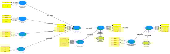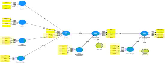 The purpose of the structural model is to assess the model’s predictive capacity, analyse the path coefficients, and conduct hypothesis testing using T-values. The model’s predictive power, as indicated by Table 5 and Figure 2, ranges from 0.829 to 0.941. This suggests that intelligent production planning and control, intelligent supply chain, intelligent purchasing, and automation collectively account for 94.1% of the variance in the adoption of smart manufacturing. Smart manufacturing adoption accounts for 82.9% of the variability in sustainable production intentions. The intention to engage in sustainable production accounts for 92.4% of the variability observed in pro-environmental behaviour. To evaluate the predictive validity of the model in Table 5, a design redundancy analysis was performed using cross-validation. The Q2 values, ranging from 0.581 to 0.728, indicate that the model possesses significant predictive relevance as they are greater than zero. Figure 3 displays the path coefficients and corresponding hypotheses.