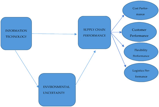With the increasing importance of the SC, it has become critical to regularly measure the SC’s performance for its success. By measuring the SC performance, companies can have the opportunity to compare their performance with past periods. Improvements should be made if low performance results are obtained; thus, productivity and quality can be increased [5]. In addition, new goals can be set by strategic planning [6]. Although companies use IT to measure their SC performance, environmental uncertainties can affect the decisions and results. Environmental uncertainties can be defined as “changes in internal and external conditions that affect the SC structure, performance, and strategy” [7]. Due to the rapid changes in technology and environmental uncertainties [8], it is difficult for companies to forecast the innovations that might be introduced by the competitors [9]. Increasing levels of uncertainty cause difficulties in the decision-making process, which may lead to erroneous decisions. Although environmental uncertainties can cause crises in companies, they may create some opportunities as well [10]. To this end, companies need to analyze the environment accurately and act swiftly against opportunities and threats [11]. This strategy has been supported by the studies conducted by several researchers in the literature. If companies are agile, strategically flexible, and entrepreneurial, they can perform better in the case of high environmental uncertainty. Additionally, they may seize various opportunities by acting innovatively and properly [12,13,14,15,16]. Therefore, IT and environmental uncertainty have a significant impact on the success of companies in SCs. In this context, this study aims to examine the relationship between IT and SC performance and to investigate whether environmental uncertainty has a mediating role in this relationship. To this end, we focus on the question “Does information technology affect supply chain performance and is there a mediating role of environmental uncertainty on this effect?”.