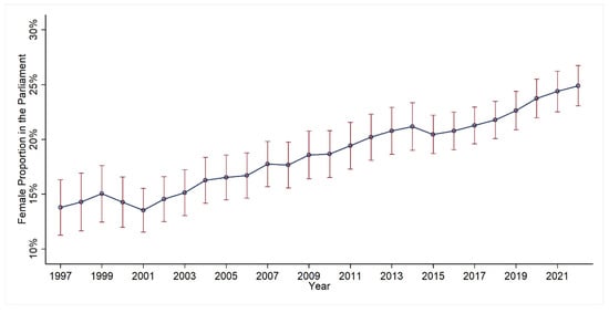 The independent variable in this study, Female Parliamentarians (FemPar), is defined as the proportion of seats held by women in national parliaments, a measure consistent with previous research [24,32,34,108,109,110,111]. Data on female parliamentarian representation were sourced from the Inter-Parliamentary Union and World Bank DataBank World Development Indicators databases. Figure 1 illustrates the average proportion of female parliamentarians in the sample over time, indicating a steady increase from approximately 14% in 1997 to 25% in 2022.