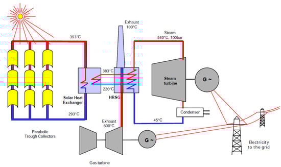 SPP1 is an Integrated Solar Combined Cycle (ISCC) with an installed capacity of 150 MW, with 25 MW from solar energy [3]. The technology used is Parabolic Trough Collectors (PTCs), providing additional thermal energy to the combined cycle (Figure 1). The PTC technology is at a more advanced stage than other CSP technologies (linear Fresnel, solar tower, parabolic dish). There are 224 solar collectors connected in 54 loops making up the solar array, with an input–output temperature range (290 °C–390 °C) for the heat transfer fluid (Therminol-VP1). The power block consists of two SGT-800 gas turbines (2 × 45 MW) and an SST-900 steam turbine (80 MW). The heat transfer fluid, heated by the sun’s rays concentrated by PTCs, transmits the thermal energy to a secondary circuit (water) (Figure 2). The additional steam produced is fed into the heat recovery steam generator, which is simultaneously heated by exhaust gases. All the steam produced is then introduced into the steam turbine to generate electricity.