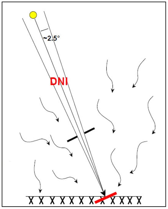 - Solar Resource (SR): The main component of solar radiation, which is useful for concentrating solar energy, is the direct one (Figure 5). The annual value of the Direct Normal Irradiation is considered (DNI, in kWh.m−2.year−1). In the majority of cases, it is the most important criterion and directly linked to power plant costs [18].
