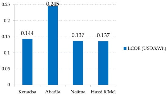 - An economic model was developed in order to compare the “technical” ranking with the “economic” one. The latter is established on the basis of the Levelized Cost of Electricity (LCOE) (see Appendix A). The LCOE values are, respectively, 0.137 USD/kWh (HRM), 0.137 USD/kWh (Naâma), 0.144 USD/kWh (Kenadsa) and 0.245 USD/kWh (Abadla) (Figure 8). HRM and Naâma have the lowest costs. However, the relative difference between the LCOE of HRM, Naâma and Kenadsa is small (<5%). The LCOE of Abadla is much higher: +80% compared to HRM. As noted when comparing NPI values, two categories of criteria are highlighted by the economic model: on the one hand, Kenadsa, Naâma and HRM have comparable costs, while Abadla have much higher costs.