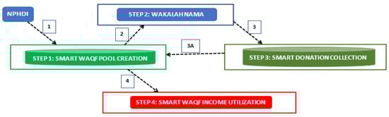 Smart Waqf Pool Creation: The foremost step to create a sustainable financing model for NPHDI is to create a waqf pool (refer to Number 1 in Figure 1 above). With an initial waqf donation by the promoters of NPHDIs, this waqf pool is established with a formal written waqf deed signed by the waqf establishers, and witnesses. Original waqf donation can be in form of either cash or property. SMART means are utilized to establish this waqf pool—usually bank accounts for cash waqf, while for property or business waqf, the SMART means are utilized to initiate the process of property or business transfer to Waqf Pool—and they are later materialized accordingly through proper documentation in due course. The waqf donations need to be kept intact and invested for revenue generation purposes, and only revenue generated will be utilized. Hence, the income received from these invested amounts can only be expended on the beneficiaries of the waqf (refer to Step 1 in Figure 1 above).